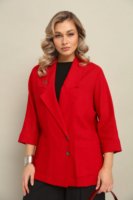 Жакет большого объёма с двубортной застежкой по одной стороне на петли и пуговицы. Рукава 3/4 с манжетами. Жакет без подкладки. По переду расположены накладные карманы. Длина жакета по спинке 70-72 см.