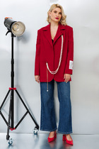 Жакет свободного силуэта с центральнойзастежкой на пришивные кнопки. По переду обраюотаны накладные карманы. Рукав втачной одношовный, из отделочной ткани. Воротник - стойка. Частичная подкладка по переду и спинке.