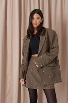 Жакет рубашечного типа прямого силуэта с асимметричным низом. Рукав втачной со спущенной линией плеча, фиксируется на пату. Застежка центральная на петли и пуговицы, смещённая по косой. На левой полочке накладной карман с клапаном. Воротник отложной на стойке до половины спинки.