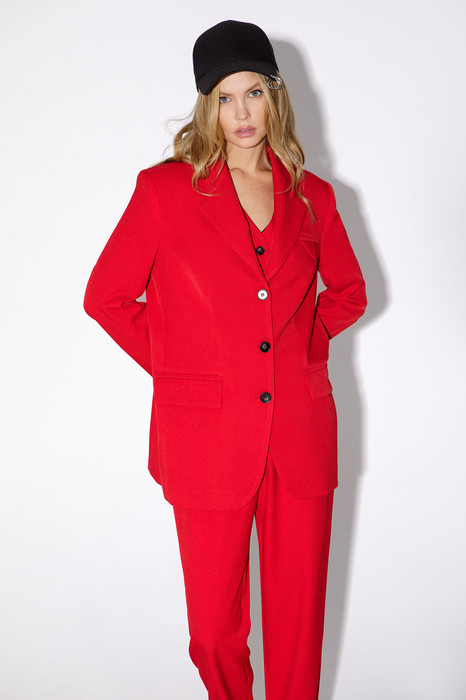 Свободный жакет с разрезами по низу рукавов. Детали: жакет прямого силуэта, пиджачный воротник, перед с прорезными функциональными карманами, нагрудный декоративный карман, однобортная застежка на петли и пуговицы, спинка со средним швом, рукава втачные двухшовные с разрезами по низу, жакет на подкладке.