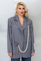Текстильный жакет с металлической бахромой по спинке. Детали: жакет прямого силуэта, пиджачный воротник, прорезные карманы с клапанами, спинка со средним швом, втачные двухшовные рукава, жакет на подкладке