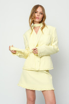 Детали: жакет полуприлегающего силуэта, отрезные бочки, воротник-бант, двубортная застежка на петли и пуговицы, спинка со средним швом и шлицей, втачные длинные рукава со шлицами, жакет на подкладке.