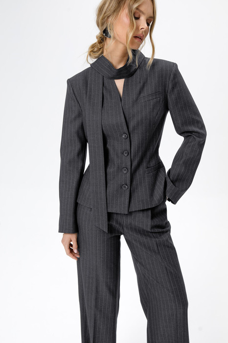 Детали: жакет полуприлегающего силуэта, цельнокроеный воротник-стойка, рельефные швы переда и спинки, функциональные карманы, застежка на петли и пуговицы, на подкладке. В комплекте съемный шарфик.