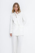 Модель прямого силуэта, на подкладе, с двубортной застёжкой на петли и пуговицы. Спереди прорезные карманы в рамку с клапаном. Средний шов спинки снизу заканчивается шлицей. Воротник английский. По низу рукава отлетная шлица с декоративными петлями и пуговицами.