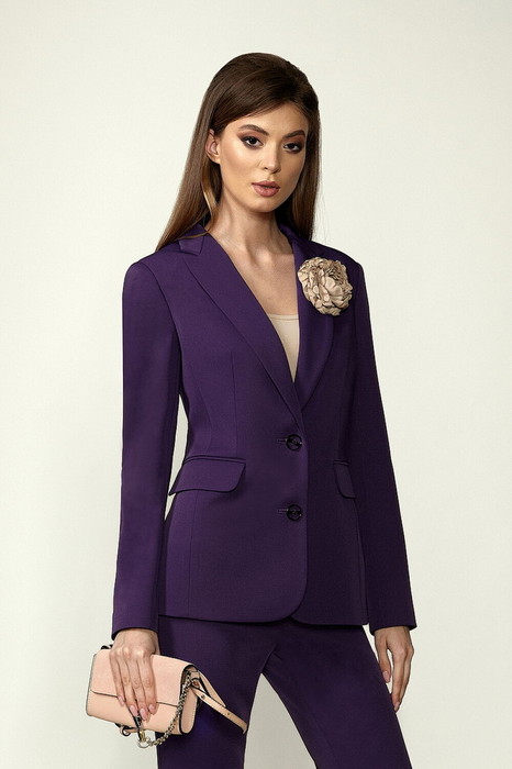 Жакет на подкладке приталенного силуэта с прорезными карманами с клапанами по переду. Воротник-английский. Рукава-двухшовные. Застегивается на две пуговицы. Декоративная брошь-цветок входит в комплект.