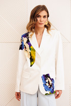 Ах , какая находка - пиджак женский с кружевом ! Молочный теплый цвет пиджака прекрасно сочетается с изысканным кружевом по низу. Пиджак прямого силуэта с двубортной застежкой и прорезными карманами с клапанами. Воротник-с отложными лацканами пиджачного типа. Рукава двухшовные, длинные. Только представьте, как изысканно будет смотреться это нежное изделие в комплекте с атласным платьем, юбкой или как представлено на фото с платьем из вуали! А можно носить просто, как самостоятельную вещь! Длина жакета 44-48р - 82см +10см кружево, 50-54р- 84см+10см кружево