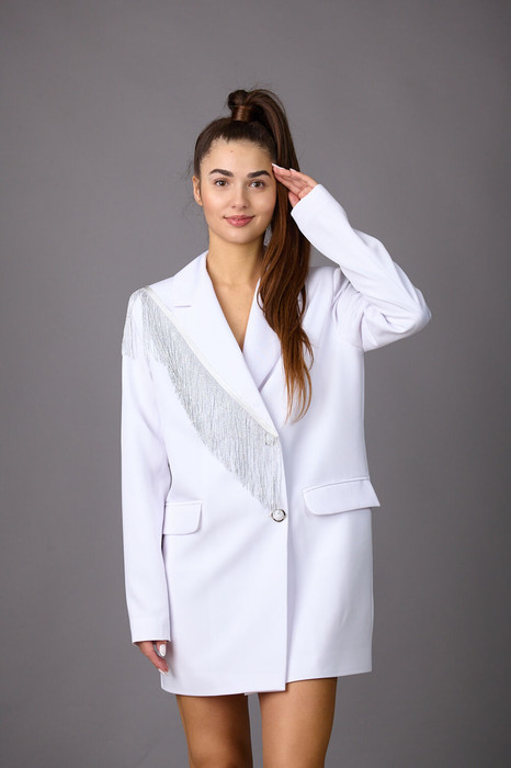 Представляем жакет женский из костюмной ткани на подкладке, который станет незаменимым спутником в вашей жизни. Лаконичный прямой силуэт жакета с двубортной застежкой прекрасно сочетается с бахромой по лацкану, переходящей на плечо и спинку. По переду- прорезные карманы с клапанами. Воротник-с отложными лацканами пиджачного типа. Рукава двухшовные, длинные. Жакет можно носить в сочетании с платьями- комбинациями, юбками, брюками. Позвольте себе быть разной: дерзкой, нежной и невероятно стильной с нашим жакетом! Длина жакета 44-48р - 82см , 50-54р- 84см