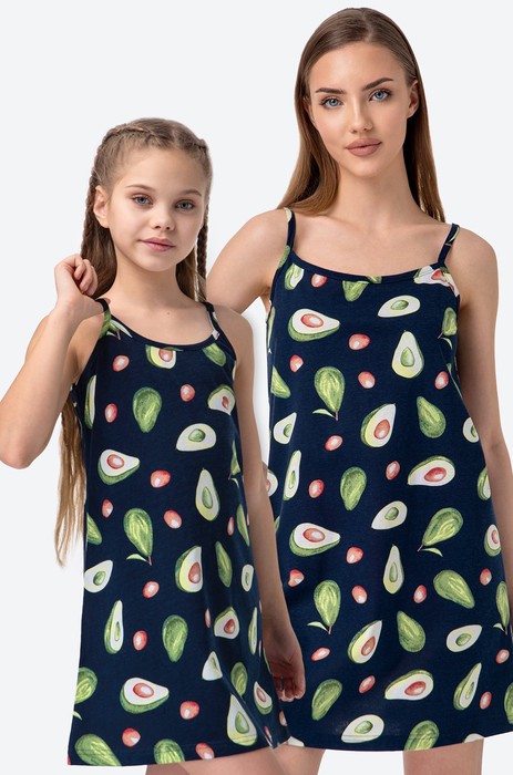 Женская ночная сорочка выполнена из натурального 100% хлопка. Тонкие бретельки и короткая длина делают ночнушку для женщин милой и кокетливой, а благодаря комфортному А-силуэту она невероятно удобная. Сорочка представлена в сине-зеленой гамме и украшена принтом Авокадо.