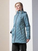 Модель с капюшоном (не отстегивается), два глубоких кармана на груди скрыты небольшими планками, линия талии выполнена резинкой, подол-баска определенно придает изделию шарма, дополняют весь образ изделия - манжеты «воланы»