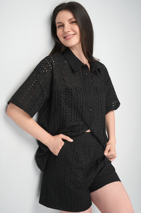 Однотонный черный костюм включает рубашку оверсайз с короткими рукавами и отложным воротником и шорты с подкладкой — отличный комплект двойка для женщин. Лёгкий хлопковый вариант подойдёт для прогулок, пляжа и других летних путешествий.