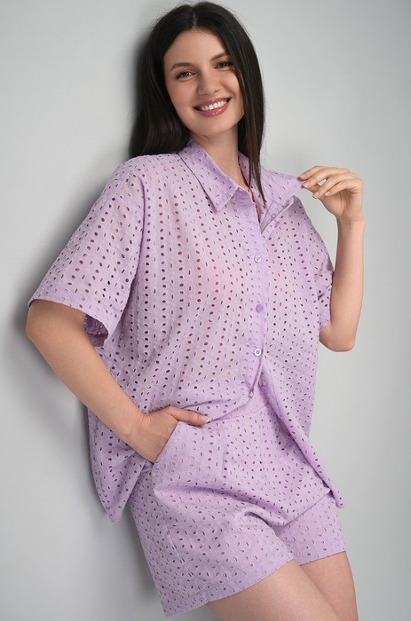 Яркий, лёгкий — этот летний женский костюм точно не останется без внимания. Сиреневый цвет, ажурная ткань шитьё и свободный силуэт делают его идеальным для жарких дней и расслабленного отдыха.