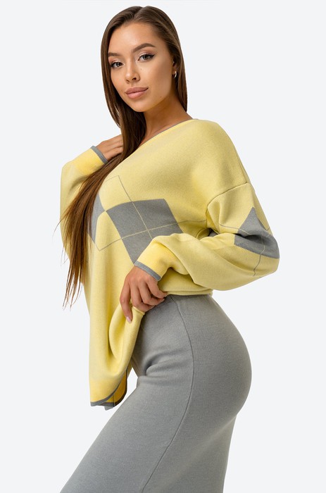 Вы не останетесь незамеченной! Этот привлекательный женский комплект из вязаного трикотажа — настоящая находка для прекрасных дам. Он сочетает в себе изысканность серого и свежесть желтого, создавая утонченный образ. Костюм состоит из джемпера со спущенным плечом и юбки на резинке.