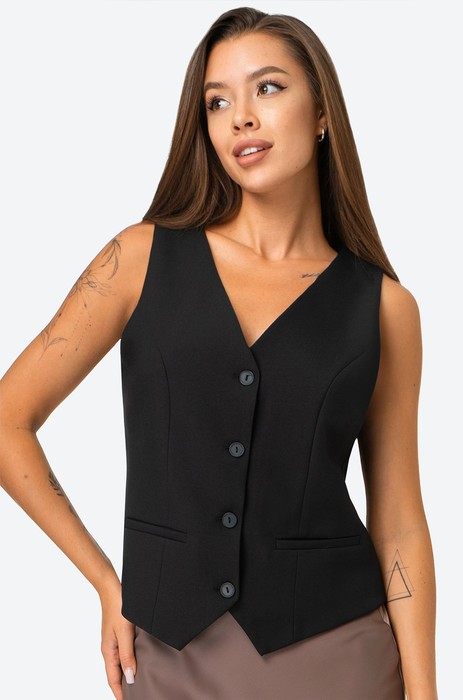 Очарование и изысканность в одном образе! Женский жилет выполнен из костюмной ткани, которая отлично держит форму. Свободная посадка, классическая застежка на пуговицы, базовый черный цвет, изящный V-вырез – этот жилет для женщин станет эффектным завершением образа в стиле офис-кор!