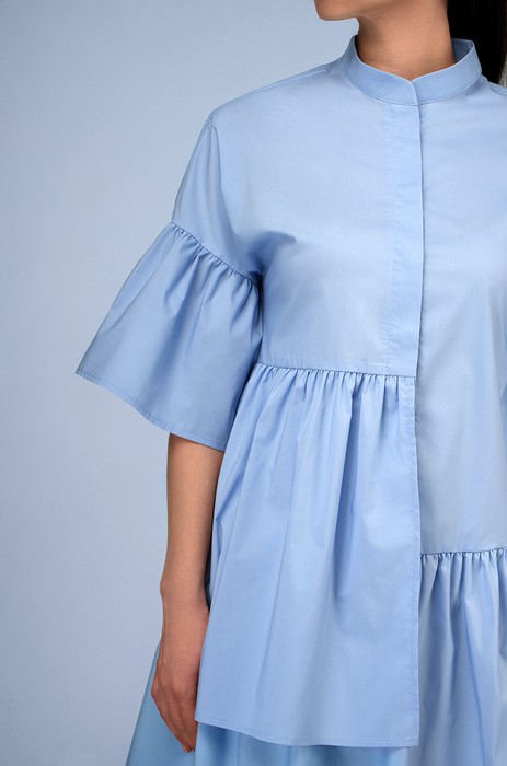 Ткань поплин с высоким содержанием хлопка — мягкая и приятная к телу. Благодаря добавлению полиэстера многослойное платье почти не мнется и легко стирается. Свободный силуэт, скрытая застёжка на пуговицы и воротник-стойка — детали, которые делают модель не просто удобной, а по-настоящему запоминающейся. Укороченная длина и короткий объемный рукав добавляют динамики и игривости.
