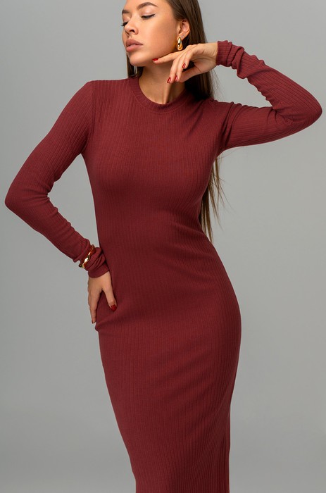 Бордовое платье имеет прямой крой и длинные рукава, что делает его универсальным и подчеркивает элегантность образа. Длина миди и круглый вырез гармонично сочетают в себе стиль и простоту. Трикотажное полотно в рубчик добавляет текстурности, создавая интересный визуальный эффект, дополняющий строгий и лаконичный силуэт.