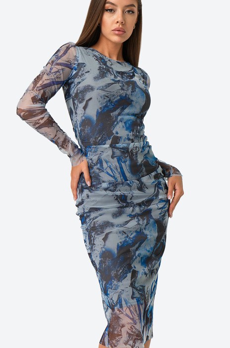 Женское платье выполнено из прочной сетки с добавлением вискозы с эластаном. Мраморный принт и прозрачные рукава с прорезями для большого пальца придают особую привлекательность и шарм.
