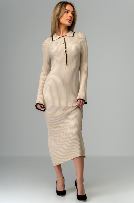 Мягкая пряжа с вискозой и акрилом в составе приятна к телу и бережно согревает. Нарядное бежевое платье идеально на каждый день. Теплое вязаное платье миди для женщин — прекрасный вариант на осень и зиму.