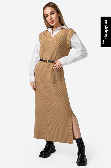 Платье-жилетка миди дарит комфорт благодаря свободному крою. Нежная фактурная вязка делает образ уютным, а V-вырез и разрезы добавляют нотку кокетства.