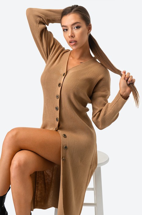 Удлиненное платье цвета кэмел выполнено из вязаного трикотажа с добавлением шерсти. Пряжа с фактурной поверхностью в рубчик дарит мягкие прикосновения.