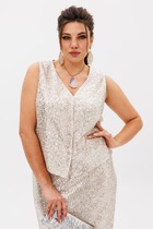 Спереди жилет украшен блестящими пайетками, которые придают образу эффектное сияние, а атласная спинка добавляет мягкость и утончённость. V-образный вырез и аккуратный хлястик на спинке делают модель особенно стильной, подчеркивая её продуманный крой. Застежка на замок завершает образ, сохраняя лаконичность и удобство.