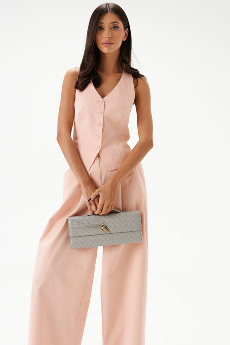 Жилет полуприлегающего силуэта. Выполнен из хлопкового полотна нежно-розового цвета. С подкладкой. Вырез горловины V-образный, переходящий в завязки на спине. Спинка открытая. Низ жилета фигурный. Застёжка центральная пуговицы. Длина по боковому шву от проймы 24 см. Жилет дополнят брюки А1543/1