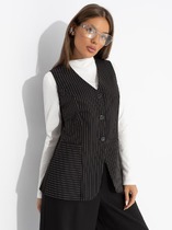 Женский жилет прилегающего силуэта, выполненный на подкладке, идеально подчеркивает фигуру. Передняя часть украшена фиктивными карманами в рамку, а V-образный вырез горловины придает образу элегантность. Застежка расположена по переду и состоит из четырех петель с пуговицами, обеспечивая надежную фиксацию и стильный вид. Спинка оформлена с центральным швом и рельефами, что добавляет изделию изящества и структурности. Этот жилет станет отличным дополнением к любому гардеробу, сочетая комфорт и утонченность.