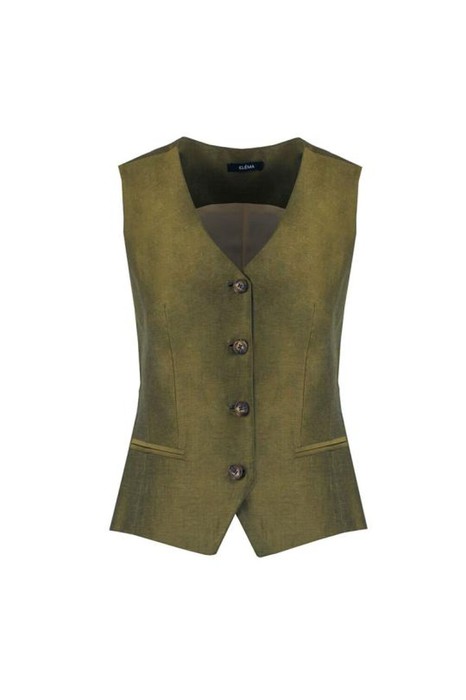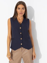 Женский жилет прилегающего силуэта, выполненный на подкладке, идеально подчеркивает фигуру. Передняя часть украшена фиктивными карманами в рамку, а V-образный вырез горловины придает образу элегантность. Застежка расположена по переду и состоит из четырех петель с пуговицами, обеспечивая надежную фиксацию и стильный вид. Спинка оформлена с центральным швом и рельефами, что добавляет изделию изящества и структурности. Этот жилет станет отличным дополнением к любому гардеробу, сочетая комфорт и утонченность.