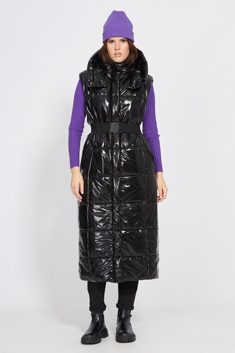 Жилет выполнен  из глянцевой плащевой ткани, простеганной с изософтом. Жилет прямого силуэта, длиной миди. Спереди застежка на молнию и кнопки на планке. Карманы прорезные, застегивающиеся на молнию. Спинка со средним швом. Воротник-стойка. Капюшон съемный, крепится на пуговицы.  В комплект входит съемный ремень из широкой эластичной тесьмы с пряжкой-карабином. Жилет на притачной по низу подкладке.