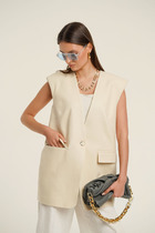 Жилет выполнен из матовой плащевой ткани, простеганной с изософтом. Жилет прямого силуэта, длиной миди. Спереди застежка на молнию и кнопки на планке. Карманы прорезные, застегивающиеся на молнию. Спинка со средним швом. Воротник-стойка. Капюшон съемный, крепится на пуговицы. В комплект входит съемный ремень из широкой эластичной тесьмы с пряжкой-карабином. Жилет на притачной по низу подкладке.