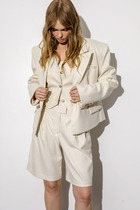 Жилет двубортный с отложным воротником на отрезной стойке, умеренного объема, прямого силуэта с застежкой на петли и пуговицы. Талия фиксируется съемным ремнем из экокожи, для которого в боковых швах оформлены шлевки. Ремень идёт в комплекте к изделию.