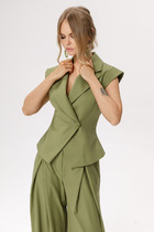 Жилет двубортный с отложным воротником на отрезной стойке, умеренного объема, прямого силуэта с застежкой на петли и пуговицы. Талия фиксируется съемным ремнем из экокожи, для которого в боковых швах оформлены шлевки. Ремень идёт в комплекте к изделию.