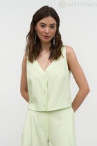 Жилетка женская из текстильной ткани (вельвет-штрукс) на подкладке. По переду расположены нагрудные вытачки, прорезные карманы в "рамку". Спинка с рельефами. По линии талии вставлен хлястик. Застежка на петлях-пуговицах. Вырез горловины V-образный.