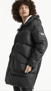 DKNY Wet Shine Coated Nylon Long Hooded Puffer black