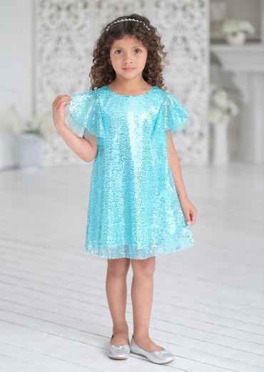 Модель платья для младшей возрастной группы. Платье силуэта-трапеция с рукавом-крылом. Платье двухслойное, из атласа и верхнего слоя сетки-пайетки. Вырез горловины имеет округлую форму. Горловина обработана по краю атласным кантом. От горловины спины обработан разрез с планкой из атласной ткани, с застёжкой на воздушные петли-пуговицы. Крылья платья двухслойные с верхним слоем сетки-пайетки и нижнего слоя мягкой сетки. Крой крыла с конической разводкой формирует мягкие спадающие фалды. Платье на хлопковом подкладе без внутренних юбок.