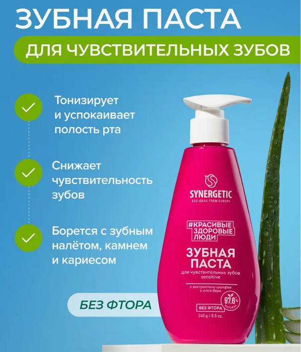 Зубная паста SYNERGETIC для чувствительных зубов SENSITIVE бережно очищает и укрепляет зубную эмаль, препятствует образованию налета и снижает чувствительность зубов. Гидроксиапатит применяется как активный элемент, реминерализующий, восстанавливающий и укрепляющий зубную эмаль. Остальные активные компоненты в этом продукте - лактат кальция и цитрат цинка. Они отвечают за насыщение эмали кальцием, уменьшение образования зубного налета и предотвращение развития зубного камня. Бисаболол успокаивает, снижает чувствительность и устраняет дискомфорт. Ксилит уменьшает количество кариесогенных бактерий и восстанавливает кислотно-щелочной баланс, а экстракты алоэ вера и кокоса прекрасно отбеливают, не разрушая эмаль. Ментол и экстракт шалфея обеспечивают длительную свежесть дыхания.