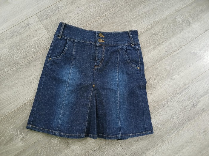 Джинсовая юбка синего цвета из качественного денима. Размер 42 (S), но лучше ориентироваться на замеры. Длина изделия — 46 см, полуобхват бедер — 44 см. Юбка украшена вышивкой на заднем кармане. Подходит для создания повседневного образа.